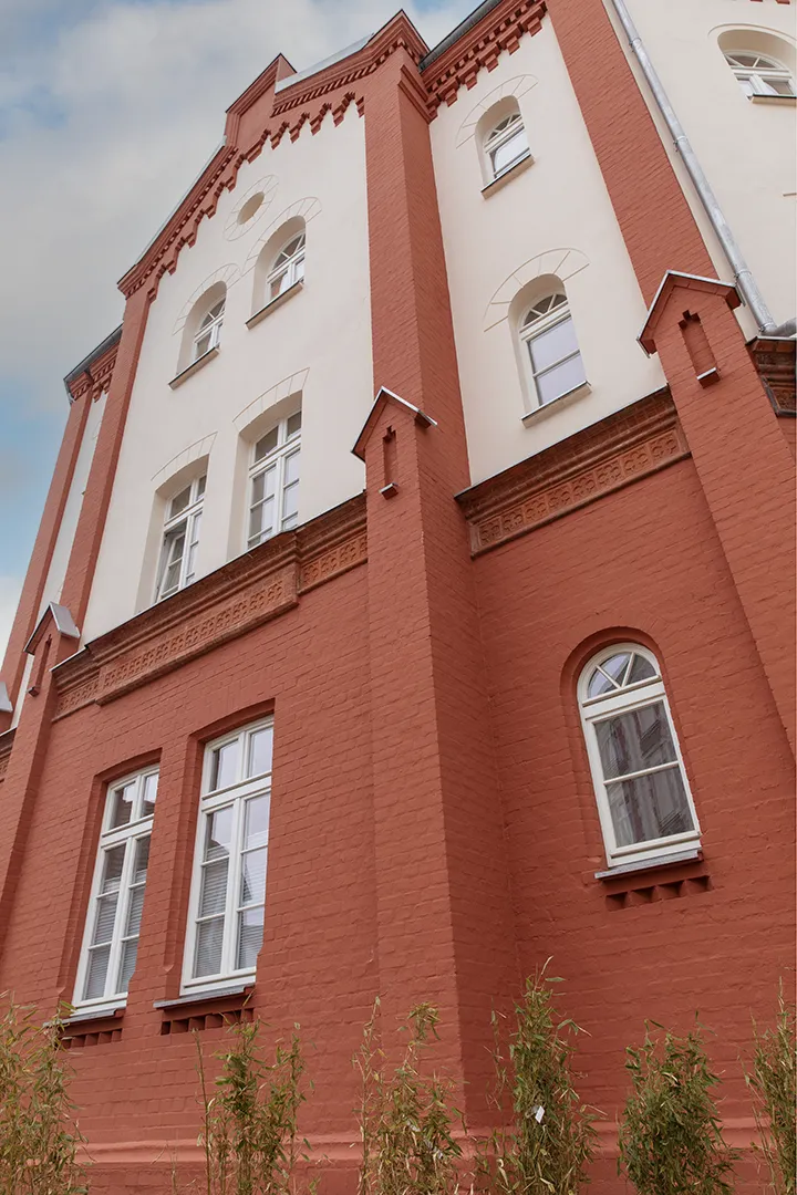 as ehemalige Areal der Schweriner Polizei am Stadthafen wurde seit 2008 nicht mehr genutzt. Nebengebäude wurden zurückgebaut. Es blieb lediglich der L-förmige Winkelbau des Hauptgebäudes aufgrund seines Denkmalstatus erhalten. Das Gelände soll nun sukzessive städtebaulich entwickelt werden. Den Auftakt bildet das alte Polizeigebäude. Hier wurden Mietwohnungen für Familien in unterschiedlichen Größen geplant. Dazu war es erforderlich, eine effiziente Nutzung mit den Belangen der Denkmalpflege an diesem besonderen Standort in Übereinstimmung zu bringen.