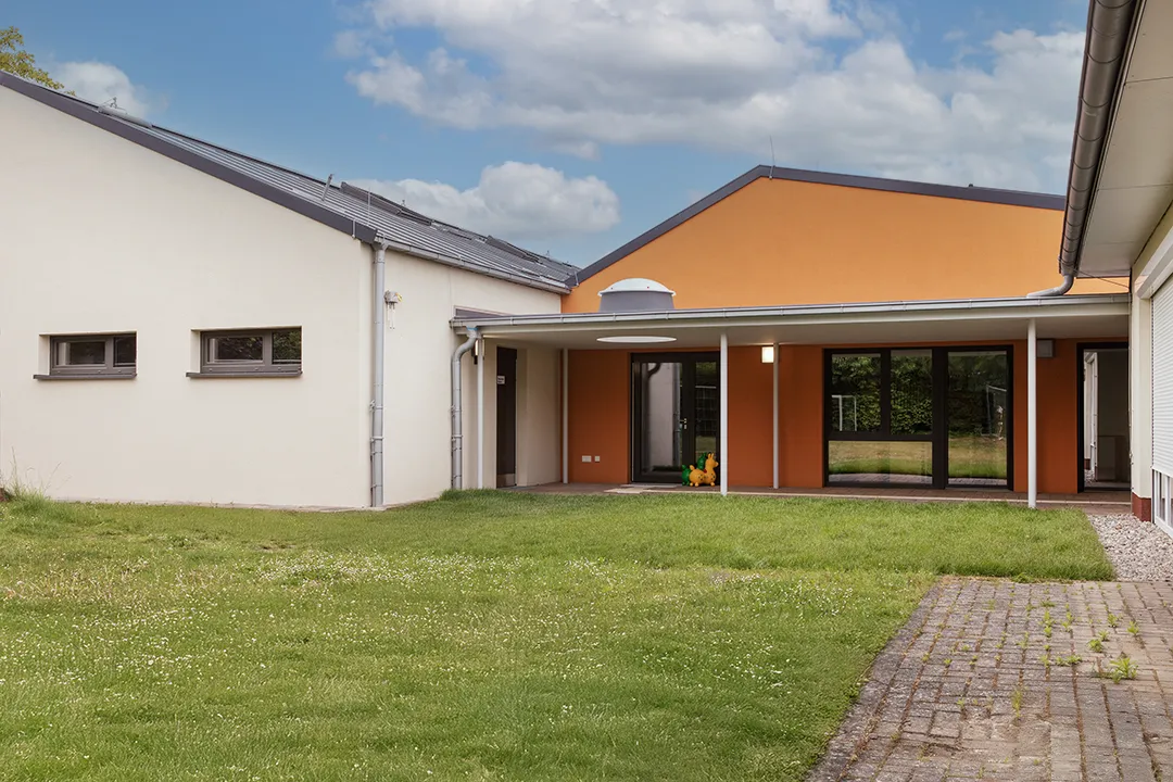 Die Kita befindet sich in zentraler Ortslage in Wittenförden. Der Altbau bestand im Wesentlichen aus 2 Gebäudeteilen aus unterschiedlichen Bauphasen., Einem östlichen Gebäudeteil mit Walmdach, der 2006 erbaut wurde und einem älteren westlichen Gebäudeteil mit Satteldach. In der ursprünglichen Planung war vorgesehen, den Westflügel im Bestand zu sanieren und für den zusätzlichen Raumbedarf einen Erweiterungsbau zu ergänzen. Im Rahmen der Voruntersuchungen zeigte sich, dass dieser erhebliche Mängel aufwies. Diese führten nicht nur im Hinblick auf den Brandschutz, sondern auch aufgrund baulicher Schäden zur Gesundheitsgefährdung der Nutzer. Aufgrund des unverhältnismäßig hohen Sanierungs- und Materialaufwands für einen Umbau im Bestand, wurde die Entscheidung für einen Abbruch des Gebäudes getroffen. Anstelle des Altbaus ist ein kompakter Neubau entstanden, der gleichzeitig den zusätzlichen Flächenbedarf berücksichtigt. Der Gebäudeteil von 2006 blieb unverändert erhalten.