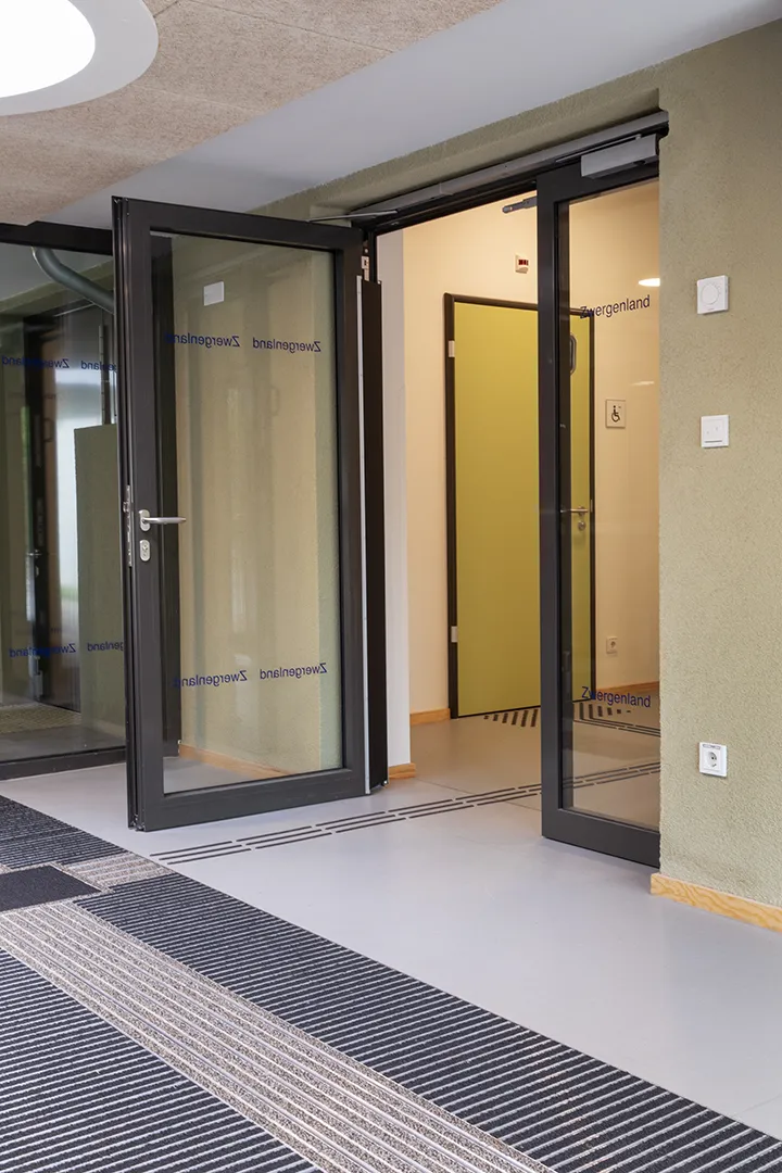 Die Materialien orientieren sich am Bestandsgebäude: Mauerwerksbau mit verputzten Wänden undNagelbrettbinder als Dachtragwerk. Der Mitteltrakt erhält allerdings eine Dachkonstruktion aus Brettstapeldecken, so dass im Mehrzweckraum die Raumhöhe großzügig bis unter die Dachschrägen führt.