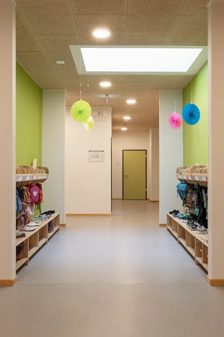 Der neue Erweiterungsbau besteht aus 3 Gebäudeteilen, dem Kindergartenbereich, dem Krippenbereich und dem mittig angeordneten Versorgungsbereich mit Mehrzweckraum. Die Mehrzweckräume des Kindergartens und der Krippe wurden zusammengefasst, so dass ein großer zentraler Raum für flexible Nutzungen entsteht. Alle Gebäudeteile werden durch ein Vordach miteinander verbunden. Damit ist eine witterungsgeschützte Zuwegung bis zum Krippeneingang/Wagenraum gewährleistet.